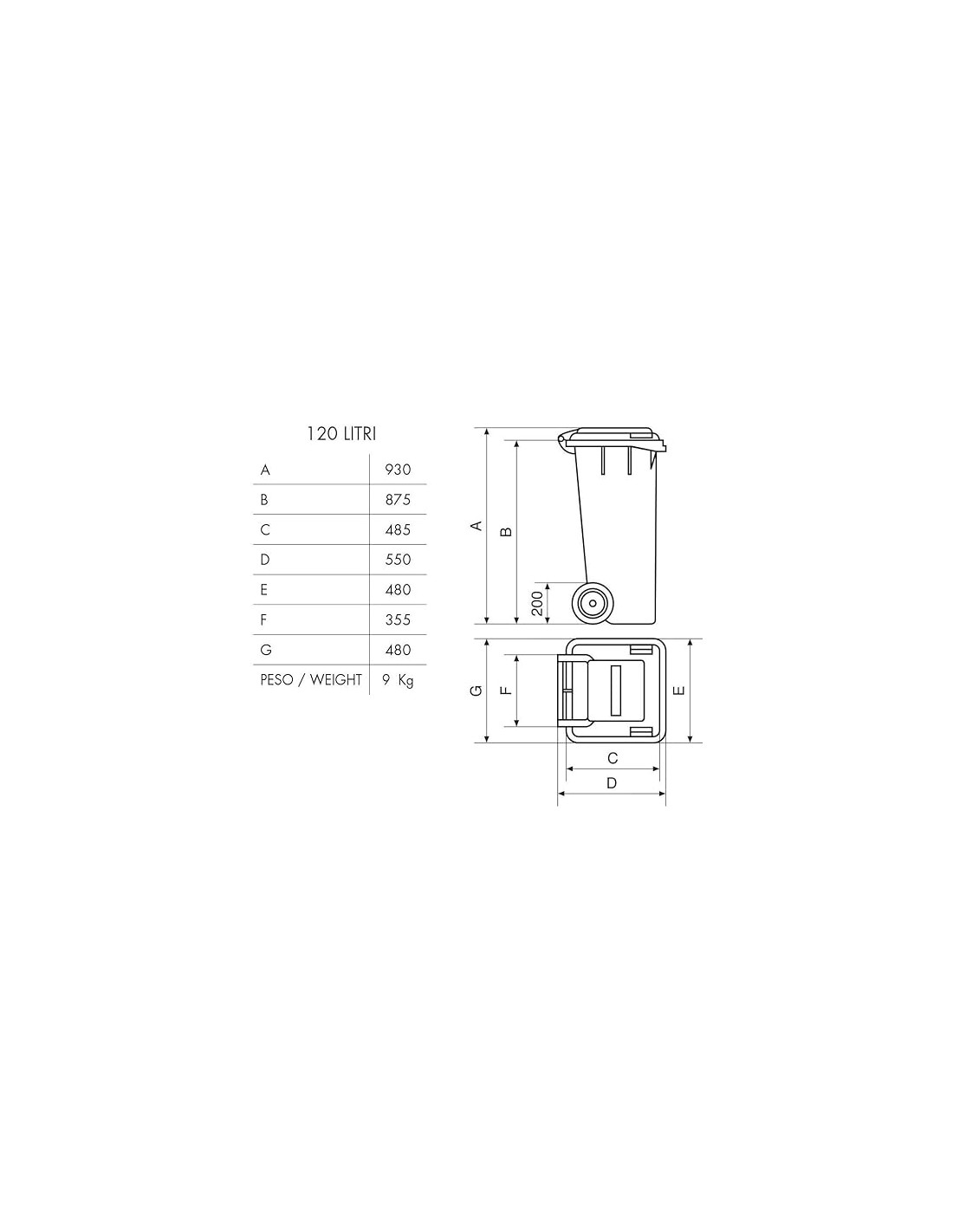 Bidone carrellato da 120 litri in PEHD con ruote in gomma Ø200 mm e presa frontale tipo A. Idoneo alla raccolta differenziata. Peso 9 kg. Portata 60 kg.