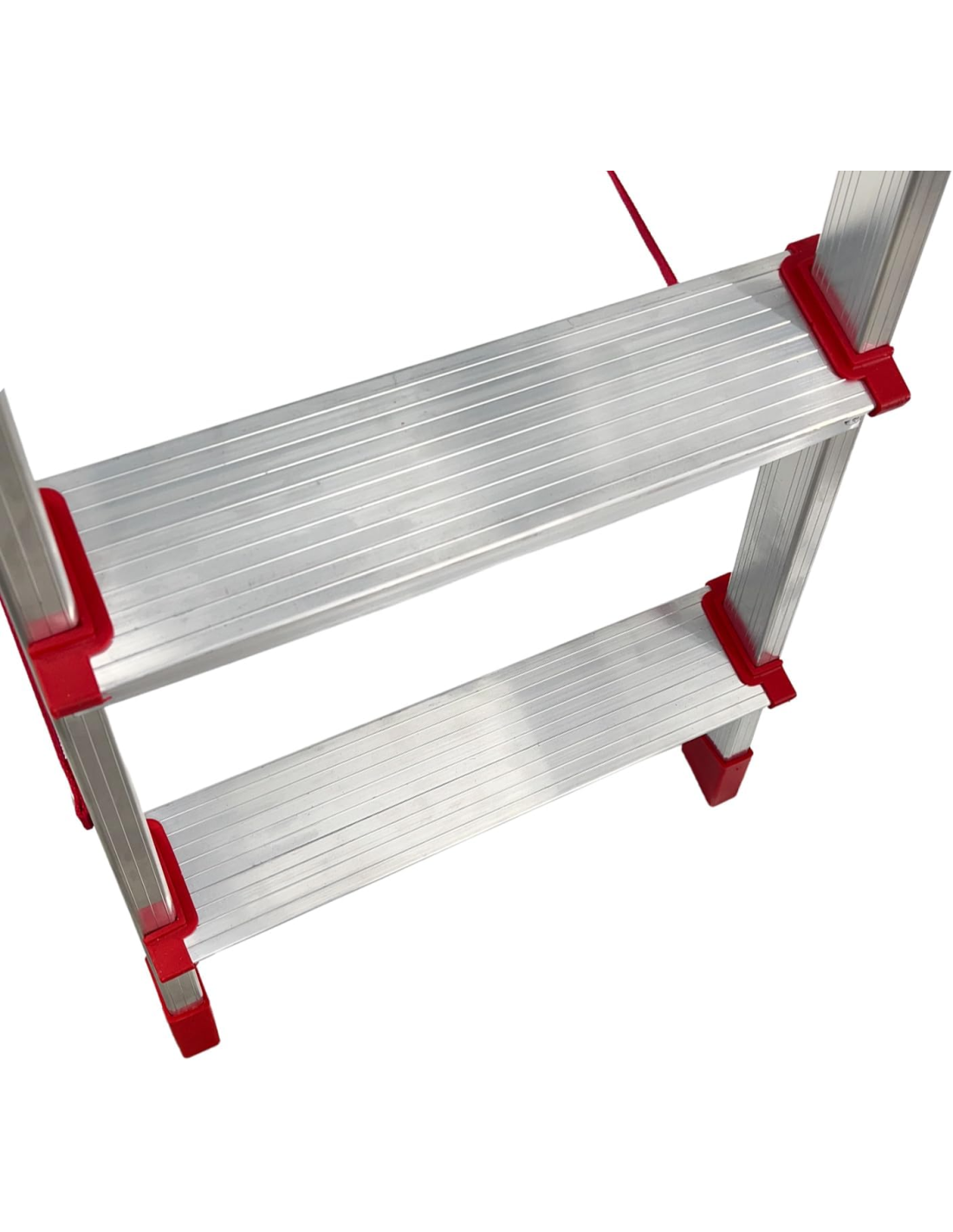 Ogni modello è dotato di gradini antiscivolo con pedata da 80 mm che garantiscono comfort e stabilità durante la salita e la discesa. La pedana superiore in acciaio zincato è ampia e stabile, sinonimo di affidabilità anche in condizioni di utilizzo prolungate. Il montante anteriore misura 40×20 mm, quello posteriore 30×20 mm, mentre i tappi in gomma alla base rendono la scala isolante e antisdrucciolo.